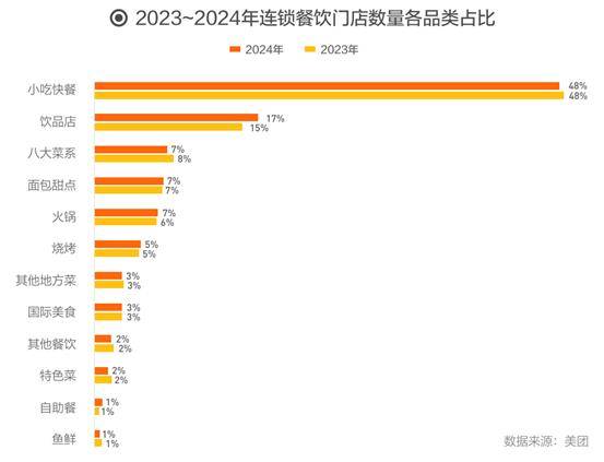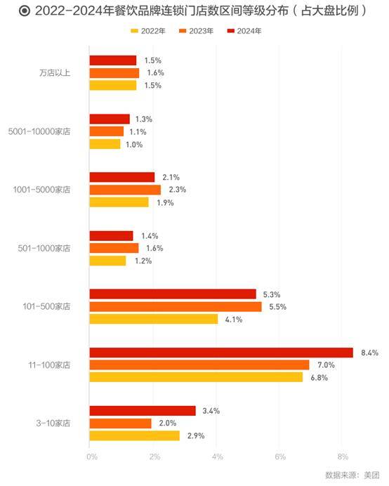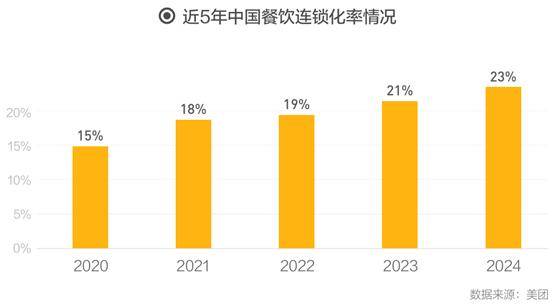 美团数据显示,2024年中国餐饮连锁化率继续提升,从2021年的18%升至2024年的23%,品牌连锁化发展稳步进行。